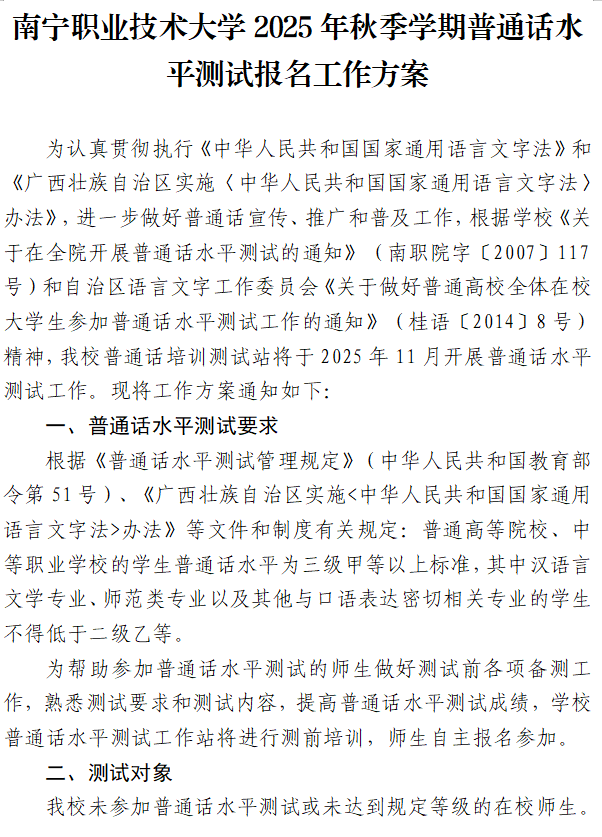 南宁职业技术大学2025年秋季学期普通话水平测试报名工作方案